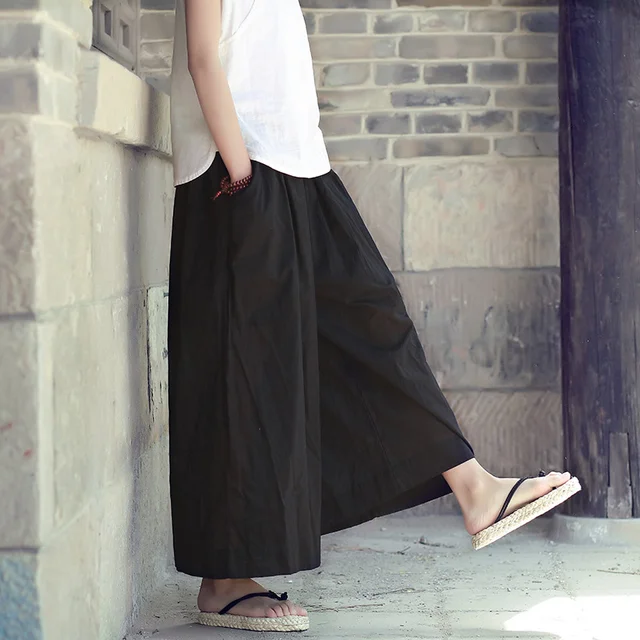 Taille élastique Solide Coton Femmes Large Jambe Pantalon Jupe Noir