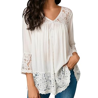 Maonet Women Loose Three Quarter V Neck T Shirt Tops Lace Chiffon