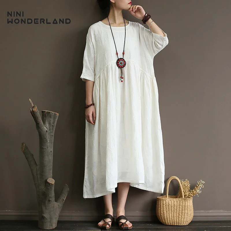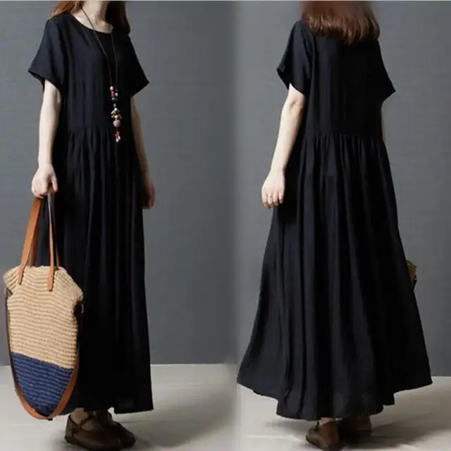 Robe Mi Longue En Coton Lin Ample Longue Grande Taille Plissée Robe