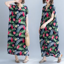 Femmes En Lin Et Coton Grande Taille Robe Ample Imprimé Brochage