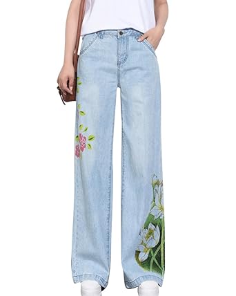 Jean Femme Taille Haute Coupe Droite Pantalon Chic Floral Imprimé